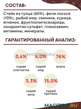 Стейк из тунца (60%), филе лосося (10%), рыбий жир, свинина, курица, ягненок, фруктоолигосахариды, хондроитин сульфат, глюкозамин, витамины, минералы.