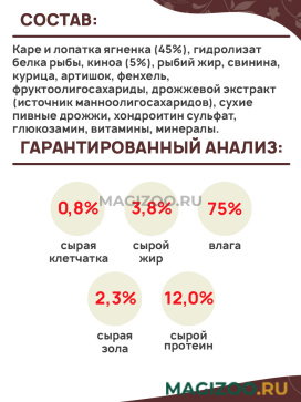 Каре и лопатка ягненка (45%), гидролизат белка рыбы, киноа (5%), рыбий жир, свинина, курица, артишок, фенхель, фруктоолигосахариды, дрожжевой экстракт (источник манноолигосахаридов), сухие пивные дрожжи, хондроитин сульфат, глюкозамин, витамины, минералы.