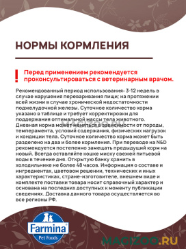 Перед применением рекомендуется проконсультироваться с ветеринарным врачом. Рекомендованный период использования: 3-12 недель в случае нарушения переваривания пищи; на протяжении всей жизни в случае хронической недостаточности поджелудочной железы. Суточное количество корма указано в таблице и требует корректировки для поддержания оптимальной массы тела животного. Дневная норма может меняться в зависимости от породы, темперамента, условий содержания, физических нагрузок и кондиции тела. Суточное количество корма может быть разделено на два и более кормления. При переводе на N&D рекомендуется постепенно замещать предыдущий корм на новый. Всегда оставляйте кошке миску свежей питьевой воды в течение дня. Открытую банку хранить в холодильнике не более 48 часов.