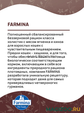 Полноценный сбалансированный беззерновой рацион класса холистик с мясом ягненка и киноа для взрослых кошек с чувствительным пищеварением.