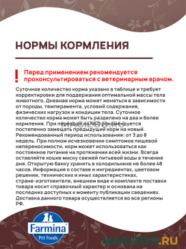 Информация о составе и ингредиентах, цветовом решении, технических и иных характеристиках, стране-изготовителе, внешнем виде и комплекте поставки товара носит справочный характер и основана на последних доступных к моменту публикации сведениях. Доставка данного товара осуществляется во все регионы РФ.Продукция FARMINA является современным стандартом безупречного качества корма. Натуральные компоненты, минеральные вещества, витамины позволяют создавать сбалансированное питание по оптимальной цене. Продукция изготавливается из сырья итальянского, французского и датского производства. FARMINA производит свою продукцию на трех собственных фабриках, которые расположены в трех странах: Италия, Бразилия и Сербия.