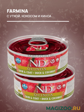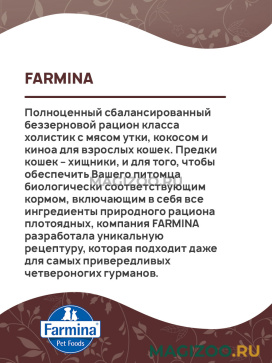 Полноценный сбалансированный беззерновой рацион класса холистик с мясом утки, кокосом и киноа для взрослых кошек.
