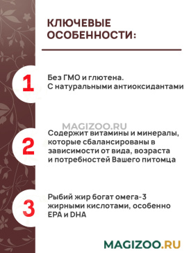 - Содержит витамины и минералы, которые сбалансированы в зависимости от вида, возраста и потребностей Вашего питомца.