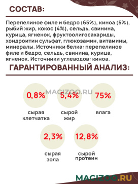 Перепелиное филе и бедро (65%), киноа (5%), рыбий жир, кокос (4%), сельдь, свинина, курица, ягненок, фруктоолигосахариды, хондроитин сульфат, глюкозамин, витамины, минералы. Источники белка: перепелиное филе и бедро, сельдь, свинина, курица, ягненок. Источники углеводов: киноа.