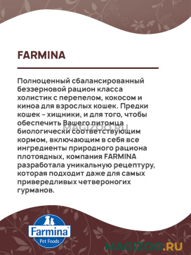 Корма FARMINA холистик-класса, а это значит, что при производстве кормов используется высококачественное сырье, которое соответствует по качеству продуктам питания, производимых для человека.