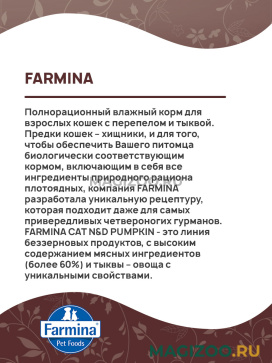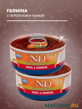 FARMINA CAT N&D PUMPKIN - это линия беззерновых продуктов, с высоким содержанием мясных ингредиентов (более 60%) и тыквы – овоща с уникальными свойствами.