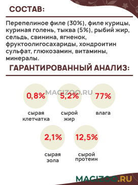 Перепелиное филе (30%), филе курицы, куриная голень, тыква (5%), рыбий жир, сельдь, свинина, ягненок, фруктоолигосахариды, хондроитин сульфат, глюкозамин, витамины, минералы.