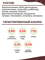 Лопатка оленины (35%), филе курицы, куриная голень, тыква (5%), рыбий жир, сельдь, свинина, ягненок, фруктоолигосахариды, хондроитин сульфат, глюкозамин, витамины, минералы.