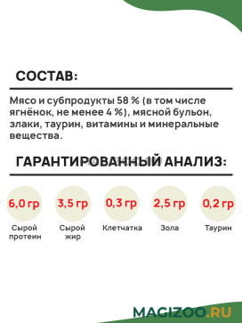 Мясо и субпродукты 58 % (в том числе ягнёнок, не менее 4 %), мясной бульон, злаки, таурин, витамины и минеральные вещества.
