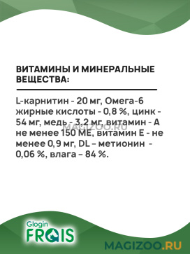 L-карнитин - 20 мг, Омега-6 жирные кислоты - 0,8 %, цинк - 54 мг, медь - 3,2 мг, витамин - А не менее 150 МЕ, витамин Е - не менее 0,9 мг, DL – метионин - 0,06 %, влага – 84 %.