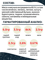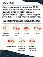 Состав: мясо курицы 20%, мясо индейки 15%, печень 15%, рубец 10%, сердце 10%, желирующая добавка, растительное масло, таурин, соль, вода.