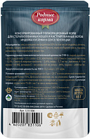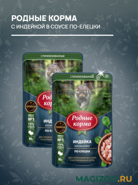 Консервированный полнорационный корм для кошек с индейкой. Кусочки в соусе по-елецки подходят для стерилизованных кошек и кастрированных котов.