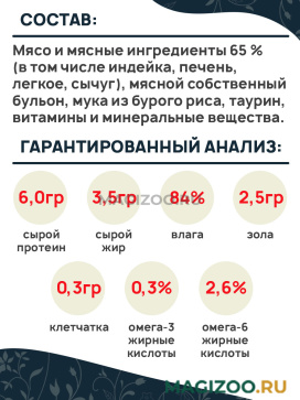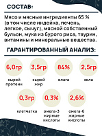 Мясо и мясные ингредиенты 65 % (в том числе индейка, печень, легкое, сычуг), мясной собственный бульон, мука из бурого риса, таурин, витамины и минеральные вещества.