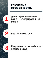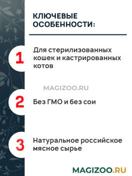 Благодаря диетическому мясу индейки Ваша стерилизованная кошка и кастрированный кот получит необходимое для взрослого животного количество белка и сохранит физическое здоровье и вес в норме.