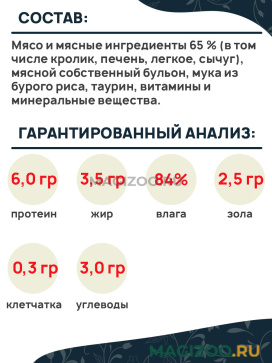 Мясо и мясные ингредиенты 65 % (в том числе кролик, печень, легкое, сычуг), мясной собственный бульон, мука из бурого риса, таурин, витамины и минеральные вещества.