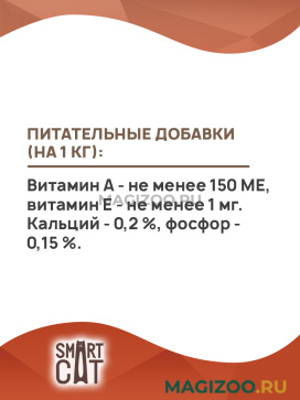 Сбалансированное питание на каждый день поможет питомцу в великих свершениях. Вашей кошке необходим корм, который будет не только вкусным, но и полезным для правильного развития организма на всех жизненных этапах. Smart Cat насыщен важнейшими элементами, которые поддерживают здоровье любимца. Здоровый питомец – новые свершения каждый день!