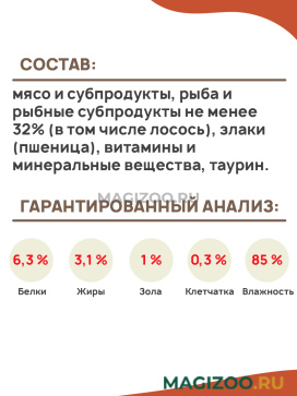 мясо и субпродукты, рыба и рыбные субпродукты не менее 32% (в том числе лосось), злаки (пшеница), витамины и минеральные вещества, таурин.