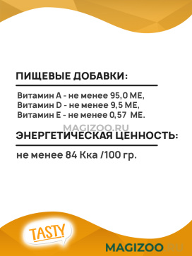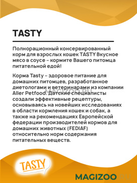 Корма Tasty обеспечивают питомцам сбалансированный рацион, содержащий необходимый для здоровья и активности комплекс витаминов, минералов и питательных веществ. Все продукты из линейки Tasty изготовлены в соответствии с сертификатом ISO 22000, который применяется при производстве продуктов питания для человека.