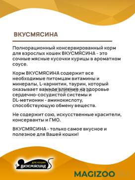 Полнорационный консервированный корм для взрослых кошек ВКУСМЯСИНА - это сочные мясные кусочки курицы в ароматном соусе.