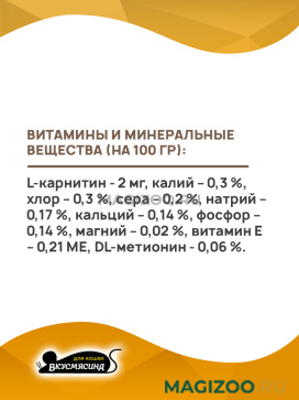 Корм ВКУСМЯСИНА содержит все необходимые питомцам витамины и минералы, L-карнитин, таурин, который оказывает важное влияние на здоровье сердечно-сосудистой системы и DL-метионин - аминокислоту, способствующую обмену веществ.