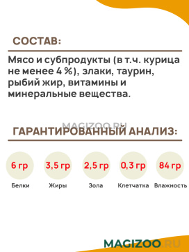 Мясо и субпродукты (в т.ч. курица не менее 4 %), злаки, таурин, рыбий жир, витамины и минеральные вещества.