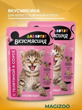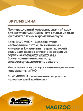 Полнорационный консервированный корм для котят ВКУСМЯСИНА - это сочные мясные кусочки телятины в ароматном соусе.