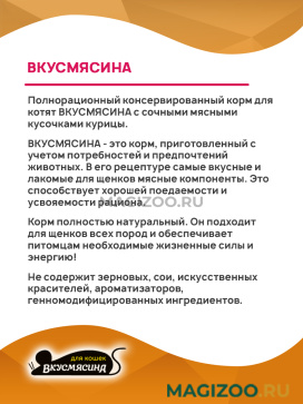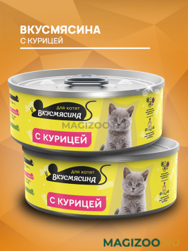 Полнорационный консервированный корм для котят ВКУСМЯСИНА с сочными мясными кусочками курицы.