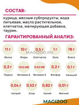 Состав: курица, мясные субпродукты, вода питьевая, масло растительное, клетчатка, желирующая добавка, таурин.