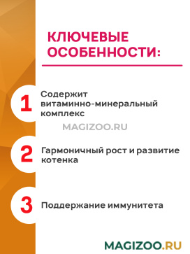 Корм полностью натуральный. Он подходит для котят всех пород и обеспечивает питомцам необходимые жизненные силы и энергию!