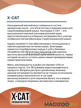 Насыщенный мясной вкус говядины в густом ароматном соусе - это аппетитное угощение даже для самой разборчивой кошки. Консервы X-CAT — это высококачественный полнорационный корм, приготовленный из отборных ингредиентов с учетом особенностей метаболизма стерилизованной кошки.