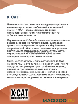 Изысканное сочетание вкусов курицы и кролика в нежном соусе станет любимым блюдом вашей кошки. X-CAT — это высококачественный полнорационный корм, приготовленный из отборных ингредиентов.