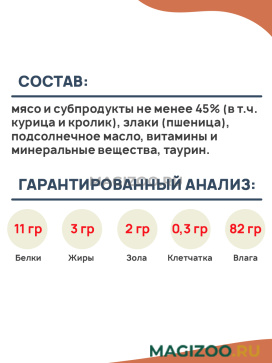 Состав: мясо и субпродукты не менее 45% (в т.ч. курица и кролик), злаки (пшеница), подсолнечное масло, витамины и минеральные вещества, таурин.