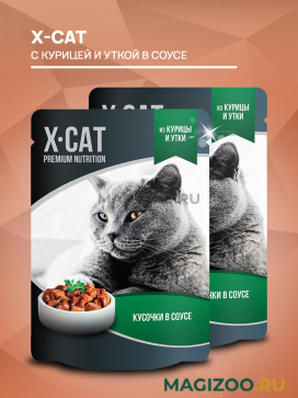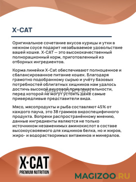 Оригинальное сочетание вкусов курицы и утки в нежном соусе подарит незабываемое удовольствие вашей кошке. X-CAT — это высококачественный полнорационный корм, приготовленный из отборных ингредиентов.