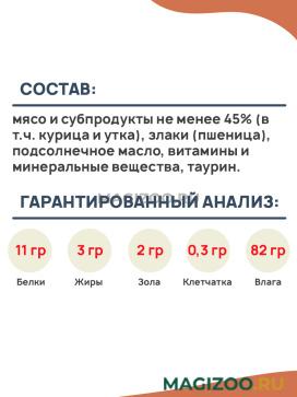 Состав: мясо и субпродукты не менее 45% (в т.ч. курица и утка), злаки (пшеница), подсолнечное масло, витамины и минеральные вещества, таурин.