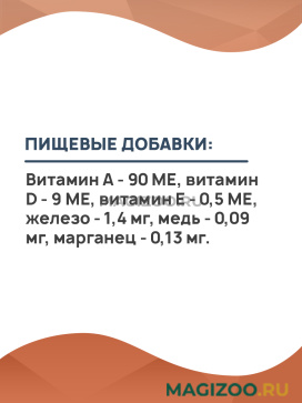 Пищевые добавки (на 100 гр) не менее: витамин А - 90 МЕ, витамин D - 9 МЕ, витамин E - 0,5 МЕ, железо - 1,4 мг, медь - 0,09 мг, марганец - 0,13 мг.