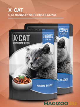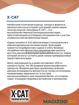 Необычное сочетание курицы, сельди и форели в деликатном соусе откроет для вашей кошки новую палитру вкусов. Консервы X-CAT — это высококачественный полнорационный корм, приготовленный из отборных ингредиентов с учетом особенностей метаболизма кошки.