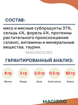 Состав: мясо и мясные субпродукты 37%, сельдь 4%, форель 4%, протеины растительного происхождения (злаки), витамины и минеральные вещества, таурин.