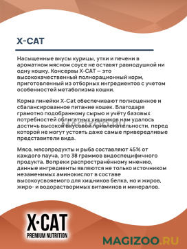 Насыщенные вкусы курицы, утки и печени в ароматном мясном соусе не оставят равнодушной ни одну кошку. Консервы X-CAT — это высококачественный полнорационный корм, приготовленный из отборных ингредиентов с учетом особенностей метаболизма кошки.