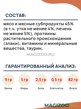 Состав: мясо и мясные субпродукты 45% (в т.ч. утка не менее 4%, печень не менее 5%), протеины растительного происхождения (злаки), витамины и минеральные вещества, таурин.