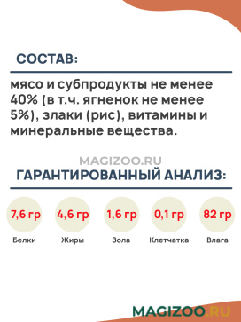 Состав: мясо и субпродукты не менее 40% (в т.ч. ягненок не менее 5%), злаки (рис), витамины и минеральные вещества.