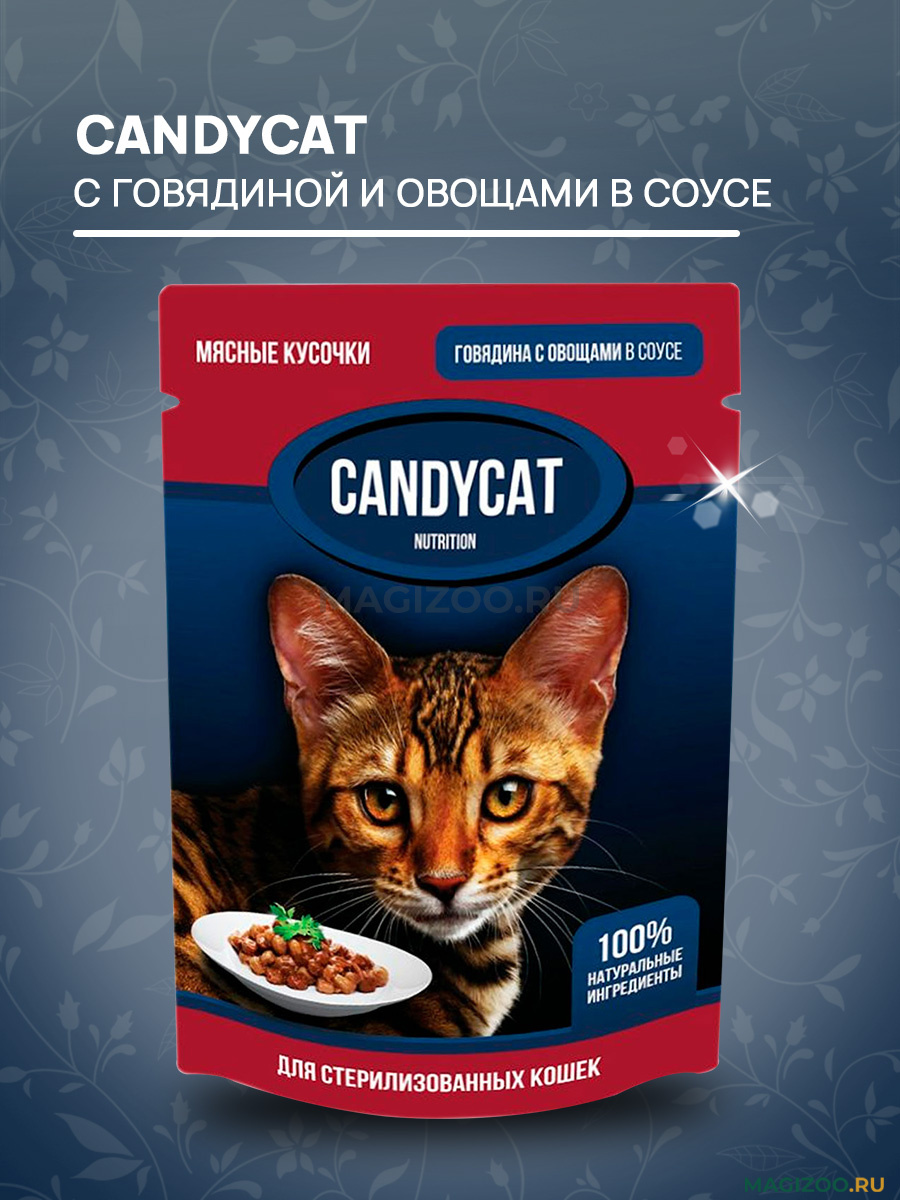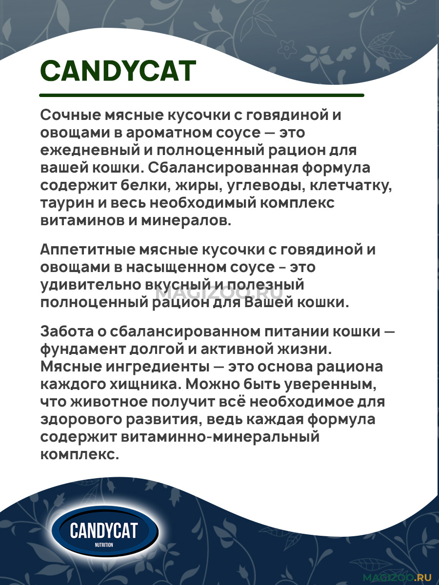 Аппетитные мясные кусочки с говядиной и овощами в насыщенном соусе – это удивительно вкусный и полезный полноценный рацион для Вашей кошки.