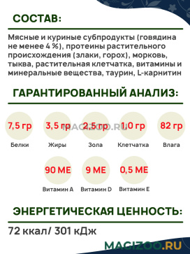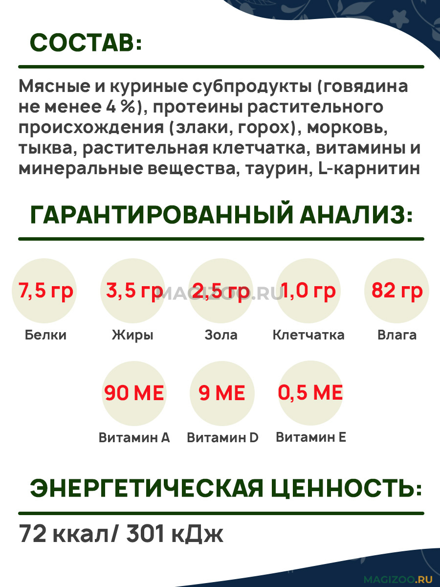 Мясные и куриные субпродукты (говядина не менее 4 %), протеины растительного происхождения (злаки, горох), морковь, тыква, растительная клетчатка, витамины и минеральные вещества, таурин, L-карнитин
