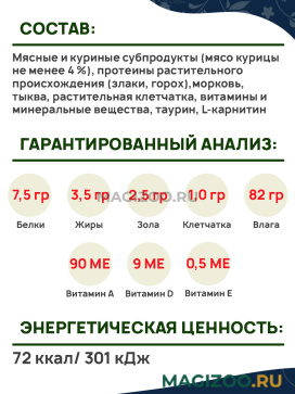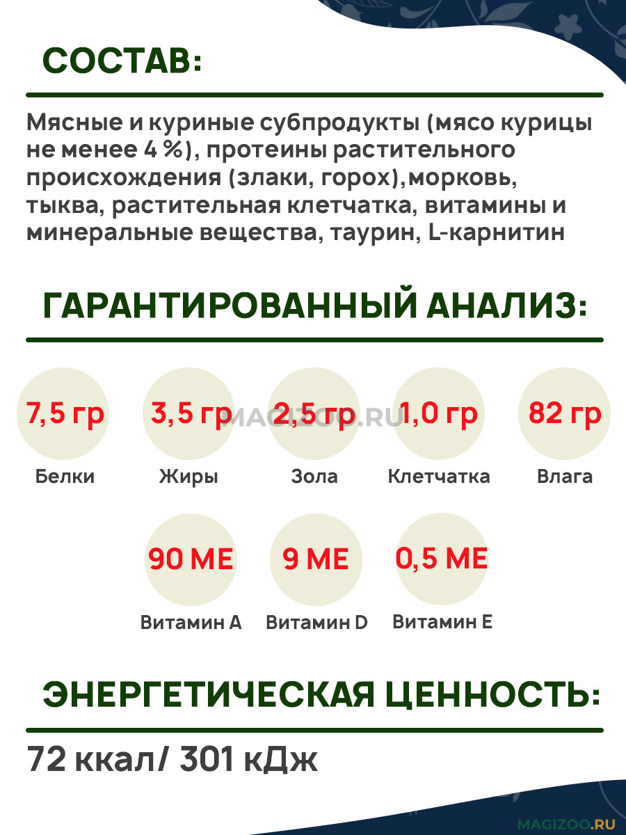 Мясные и куриные субпродукты (мясо курицы не менее 4 %), протеины растительного происхождения (злаки, горох),морковь, тыква, растительная клетчатка, витамины и минеральные вещества, таурин, L-карнитин