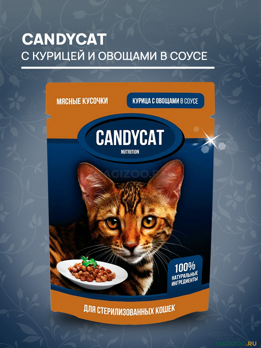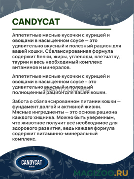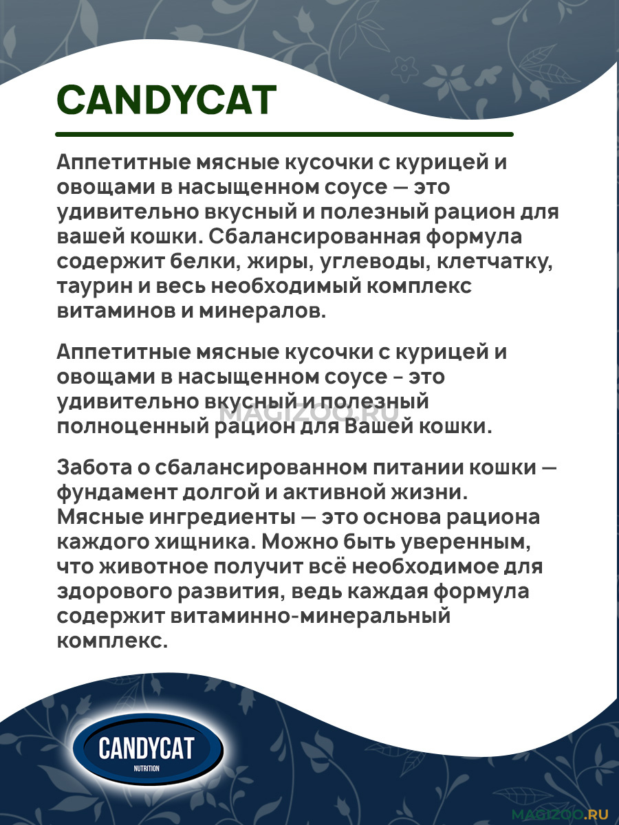 Аппетитные мясные кусочки с курицей и овощами в насыщенном соусе – это удивительно вкусный и полезный полноценный рацион для Вашей кошки.