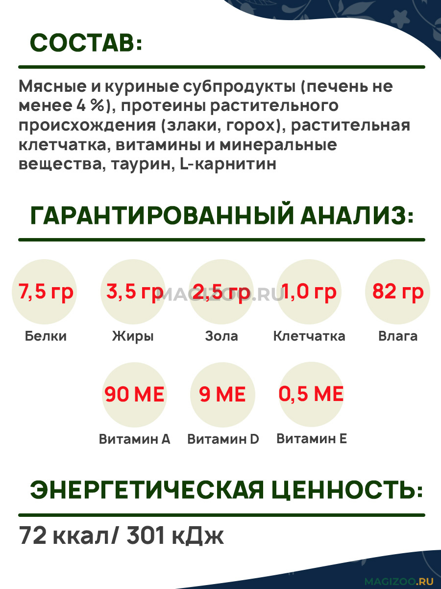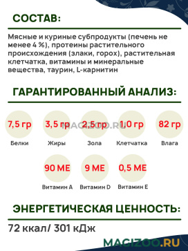 Мясные и куриные субпродукты (печень не менее 4 %), протеины растительного происхождения (злаки, горох), растительная клетчатка, витамины и минеральные вещества, таурин, L-карнитин