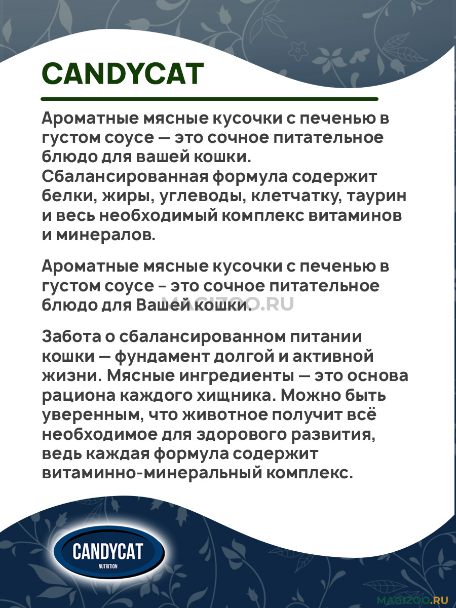 Ароматные мясные кусочки с печенью в густом соусе – это сочное питательное блюдо для Вашей кошки.