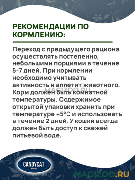 Рекомендации по кормлению: Переход с предыдущего рациона осуществлять постепенно, небольшими порциями в течение 5-7 дней. При кормлении необходимо учитывать активность и аппетит животного. Корм должен быть комнатной температуры. Содержимое открытой упаковки хранить при температуре +5°С и использовать в течение 2 дней. У кошки всегда должен быть доступ к свежей питьевой воде.
