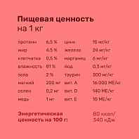 Витамин А - 16000 МЕ, витамин D - 140 МЕ, витамин Е - 10 МЕ, таурин – 300 мг, железо - 24 мг, марганец - 6 мг, цинк - 15 мг, медь - 1 мг, магний - 200 мг, йод - 0,3 мг, селен - 0,2 мг.