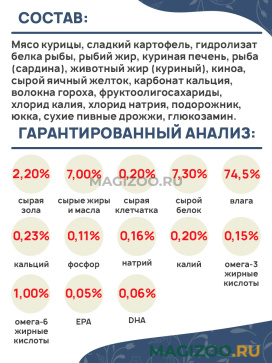 Мясо курицы, сладкий картофель, гидролизат белка рыбы, рыбий жир, куриная печень, рыба (сардина), животный жир (куриный), киноа, сырой яичный желток, карбонат кальция, волокна гороха, фруктоолигосахариды, хлорид калия, хлорид натрия, подорожник, юкка, сухие пивные дрожжи, глюкозамин.