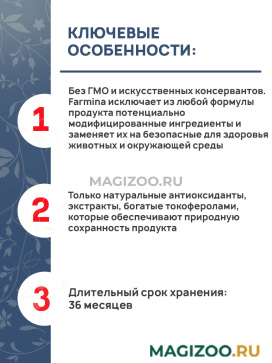 Все ингредиенты кормов Farmina - не содержат ГМО, безопасны для здоровья животных и окружающей среды.
